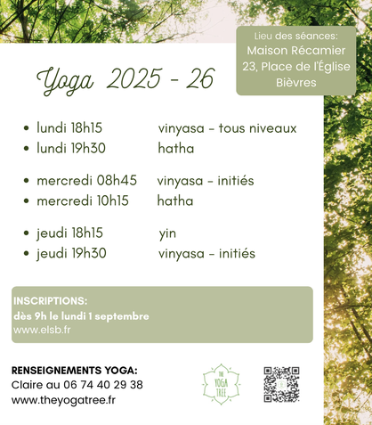 - votre tapis de yoga anti-dérapant ainsi que d'autres accessoires selon vos besoins (briques, sangle, coussin).